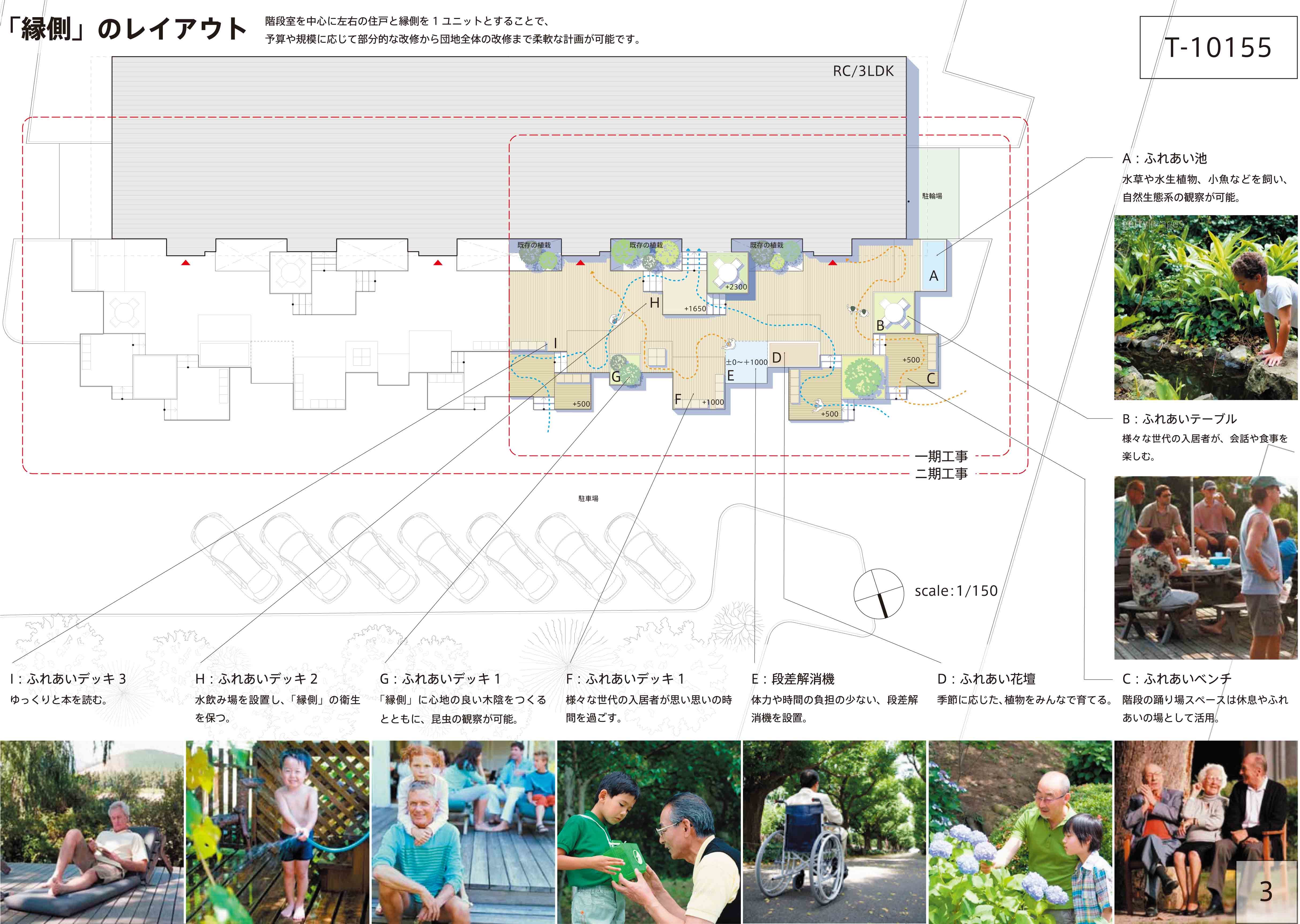 稲毛高浜北住宅管理組合、一般社団法人日本マンション管理士会連合会主催。国土交通省 平成22年度安心居住推進制度事業。マンション階段室改修提案募集公開コンペ「“街”として活きるためのマンション(団地)改修提案」応募案。応募登録番号:T10155。入選。テーマ:「縁側」階段室<つらい段差をここち良い段差に>