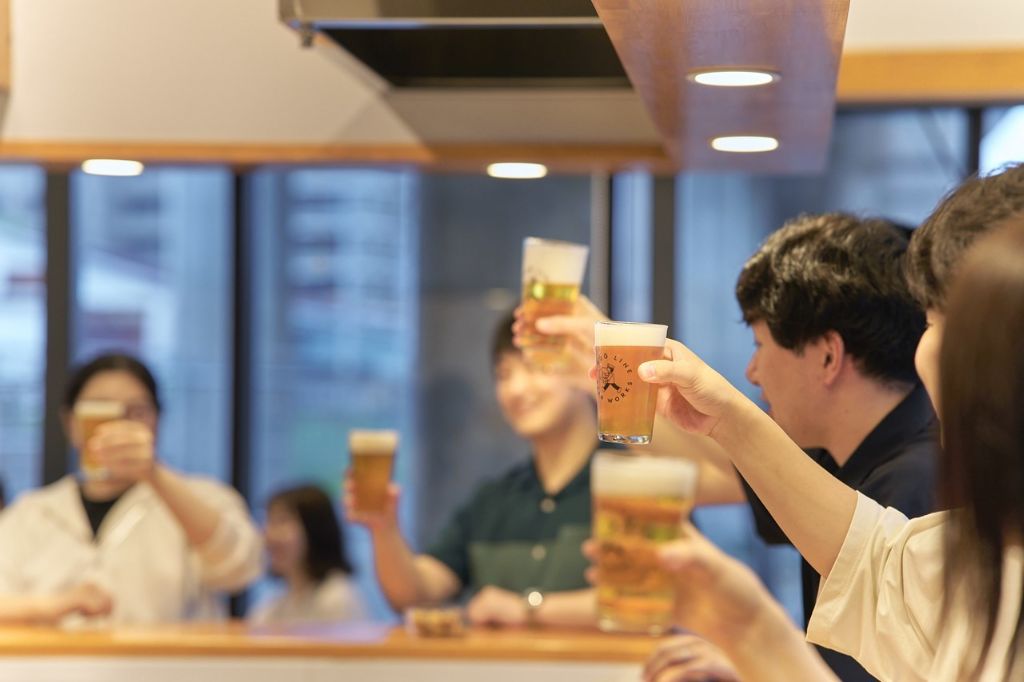 2. 境界を溶かす「縁側」と「ホップのカーテン」 飲食スペースは、限られた面積を最大限に活かすため、内部のカウンター席だけでなく、屋外に「縁側」のようなベンチを設けました。南面の窓を覆うのは、ビールの原料であるホップのグリーンカーテンです。季節ごとに育つ緑が強い日差しを遮り、木漏れ日の中で原材料の息吹を感じながらビールを味わう――。インフラの隙間に、身体的で豊かな時間を提供することを目指しました。